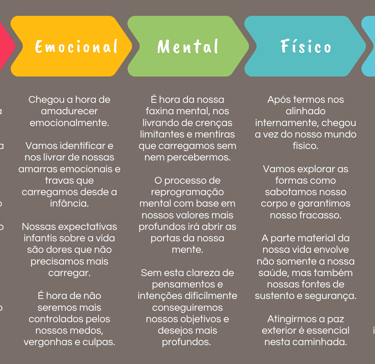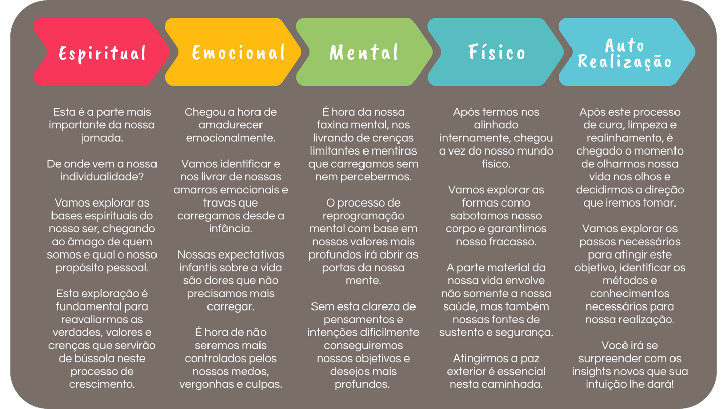 Durante 6 meses, você construirá seu Mapa Pessoal da Prosperidade, um plano único e detalhado que identifica bloqueios e define passos claros para alcançar abundância financeira, emocional e espiritual.